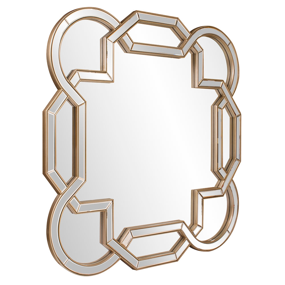 Our Aleena Mirror is a gorgeous piece. It is composed of intertwining mirrored sections that gracefully form a scalloped octagonal shape. The frame is then trimmed in champagne silver leaf. The end result is a striking piece perfect (but not limited) for your Modern, Art Deco or Traditional look. It is a perfect focal point for an entryway, bathroom, bedroom or any room in your home. D-rings are affixed to the back of the mirror so it is ready to hang right out of the box!