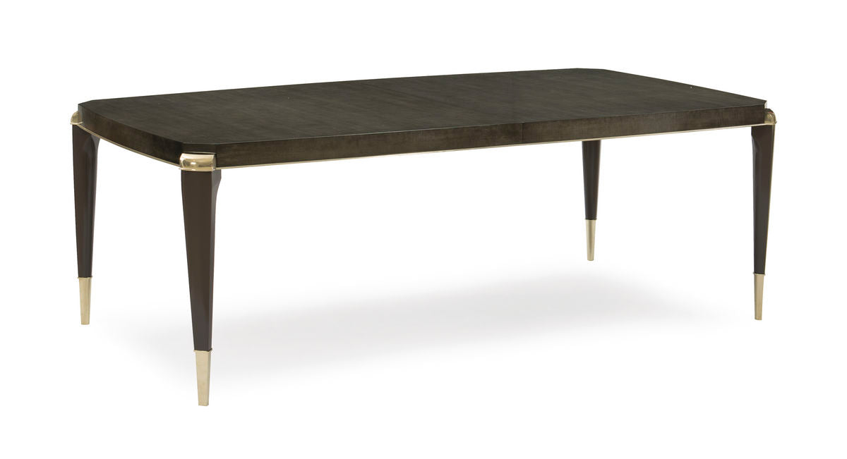For large dining parties, this Charcoal Anegre table is unmatched. The delicately figured wood, in a bowed rectangular shape, has graceful chamfered corners detailed with outstretched, Whisper of Gold metal caps. The entire apron is rimmed in a thin Whisper of Gold bead as it sits on modern cabriole legs tipped in custom gold ferrules. For dining at its best, this piece is All Trimmed Out and expands from 83 inches to 123 inches with two 20-inch leaves.
