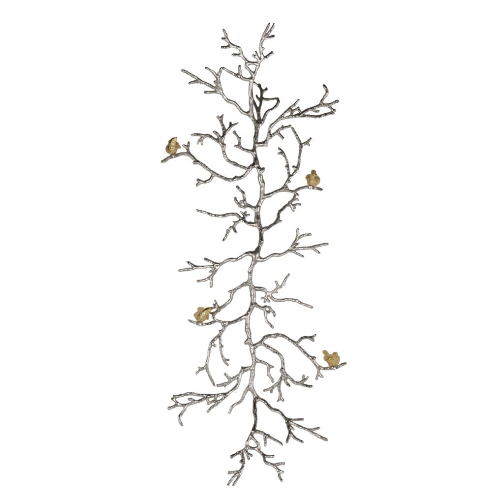 The wandering silver branches of the Atelier Branch Wall Sculpture appear almost icy yet are gently topped with four little golden birds. This sculpture is 44-inches long and is both impactful and intriguing.
