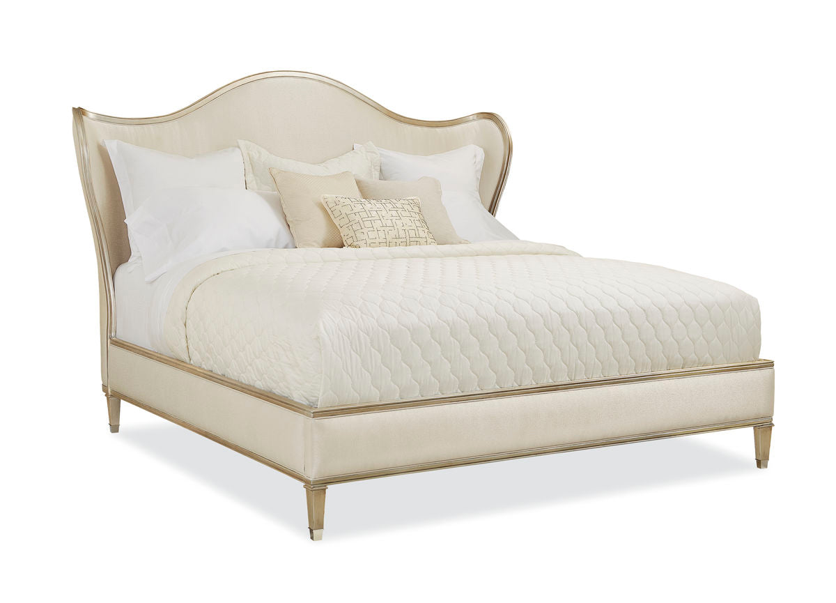 This Bedtime Beauty has a dramatically updated camel-back headboard with generous curving wings that give it regal style. The exposed exquisitely carved wood rail is finished in radiant Auric silver leaf. Fully upholstered in a cream strie fabric. This piece has a low footboard and square-tapered carved feet. Refined elegance never looked so comfortable.