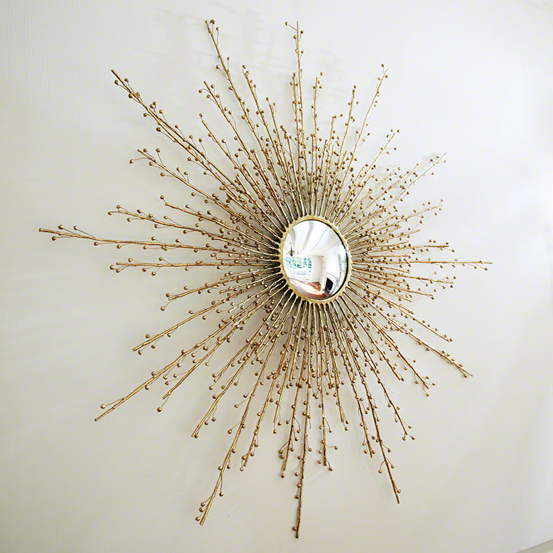 This is a convex mirror made of solid brass. Each branch and berry is hand applied to the frame by an artisan. The radiating berries give off the burst of energy that livens up any room.