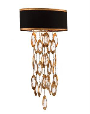 This wall sconce has a tailored, rich black shade with gold trim. The faceted crystals are suspended in metal settings cut on the bias. Shade: (12" X 6.5") X (12" X 6.5") X 5", Black with Gold Trim, Man-Made Silk. Candelabra Base, 60 W
