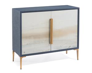 A two-door cabinet inlaid in linen and finished in indigo batik. A fragmented segment of Soft Blue River by Austin Allen James covers the two doors, which are each fitted with soft-closing hinges and bar handles in a polished brass.
