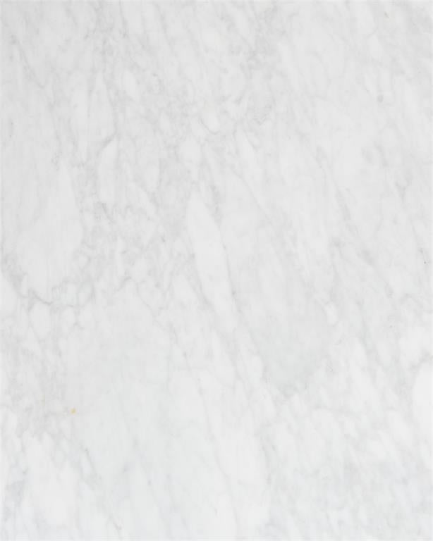 The Carrara marble top of this cocktail table is supported by a steel base finished in gold. The base features double legs strapped together with ties, which are repeated underneath the top.