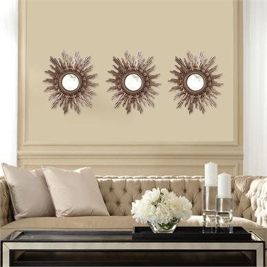 The Chelsea Mirror is a gorgeous piece. It is fashioned with an Art Deco flair. The main frame is oval shaped with bars radiating from the piece to form a starburst pattern. It is then finished in a lovely silver leaf. It is a perfect focal point for an entryway, bathroom, bedroom or any room in your home. D-rings are affixed to the back of the mirror so it is ready to hang right out of the box! The mirror on this piece is NOT beveled.