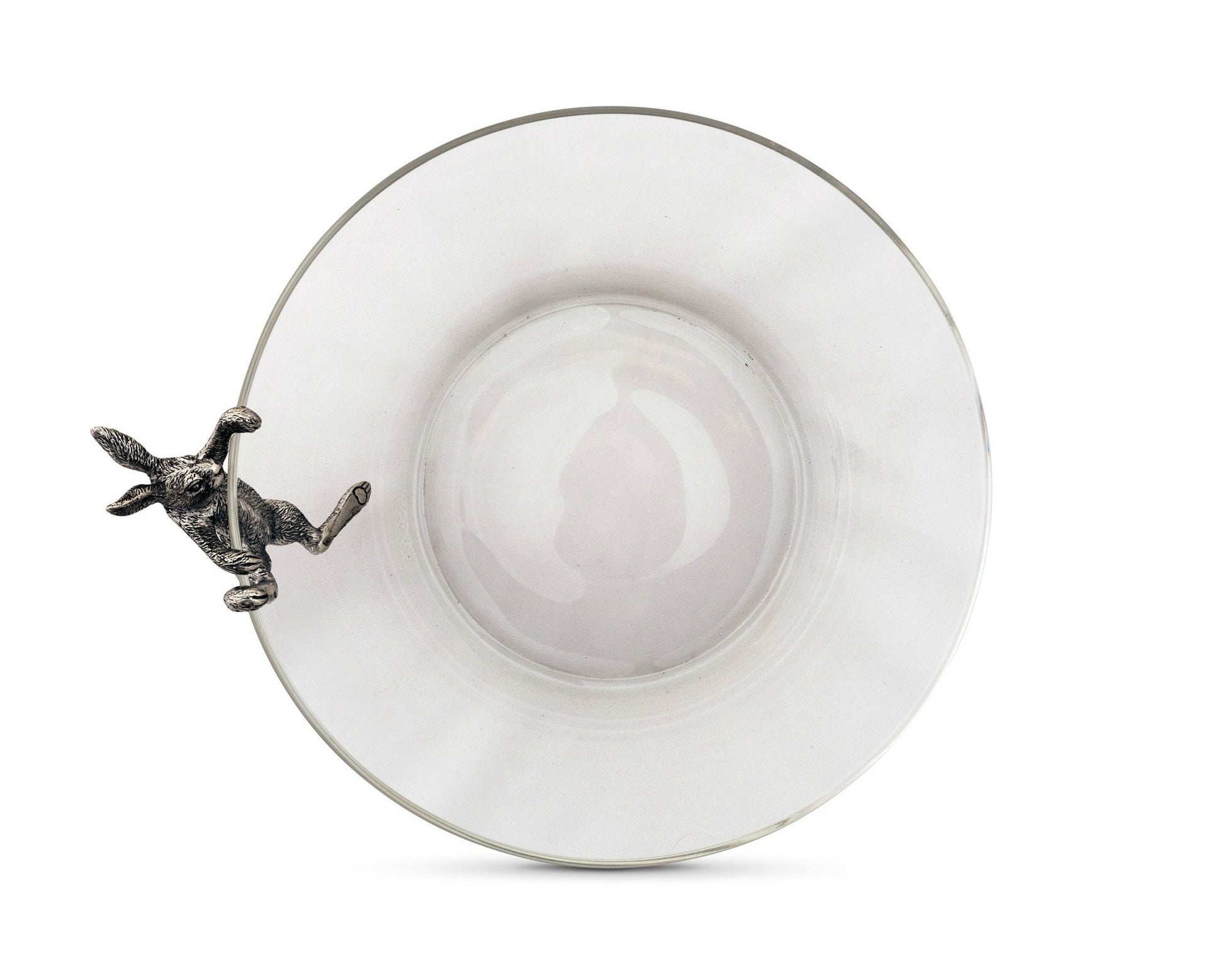 Bring the warmth of laughter to your home with the lighthearted style of this Vagabond House Climbing Bunny serving bowl. Handcrafted from the highest quality materials and covered in lifelike detail from the tips of his long ears to the toes of his dangling paw, this solid pewter bunny and his mischievous antics serve as the perfect conversation starter during Easter dinners or spring gatherings. Enchant family and friends with a tabletop display of bunny-shaped candies and cookies or a mantel centerpiece of beautifully dyed eggs. The clear glass of this generous 10 x 10 x 5-inch serving bowl creates a elegant presentation for your offerings. A natural choice for mixtures of colorful vegetables and salad dressings, its thick sides and adorably curious bunny transform even simple side dishes into table highlights.