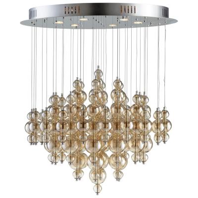 Add a welcome touch of drama to a bare nook with this six-light cognac glass pendant. This gorgeous chrome finish iron light pendant is cloaked in stunning strands of cognac glass beads.