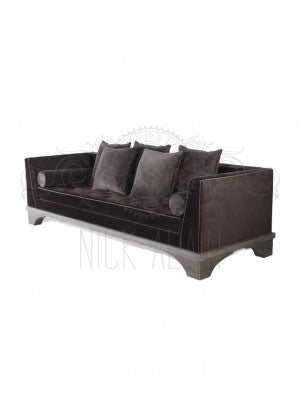 Elegant and contemporary comfort. Solid wood base in greystone wash finish. Five pillows and 2 bolsters included. Shown in Premiere Charcoal and Prima Pewter Velvet. Available in 6 to 10 feet long. Other colors and fabric grades available.