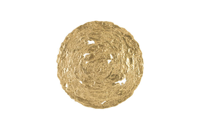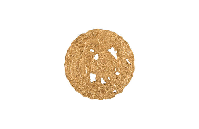 The process of melting—or fusion—which transitions a material from solid to liquid. This collection was inspired by an artisan technique of pouring metal in circular patterns over a rough surface.