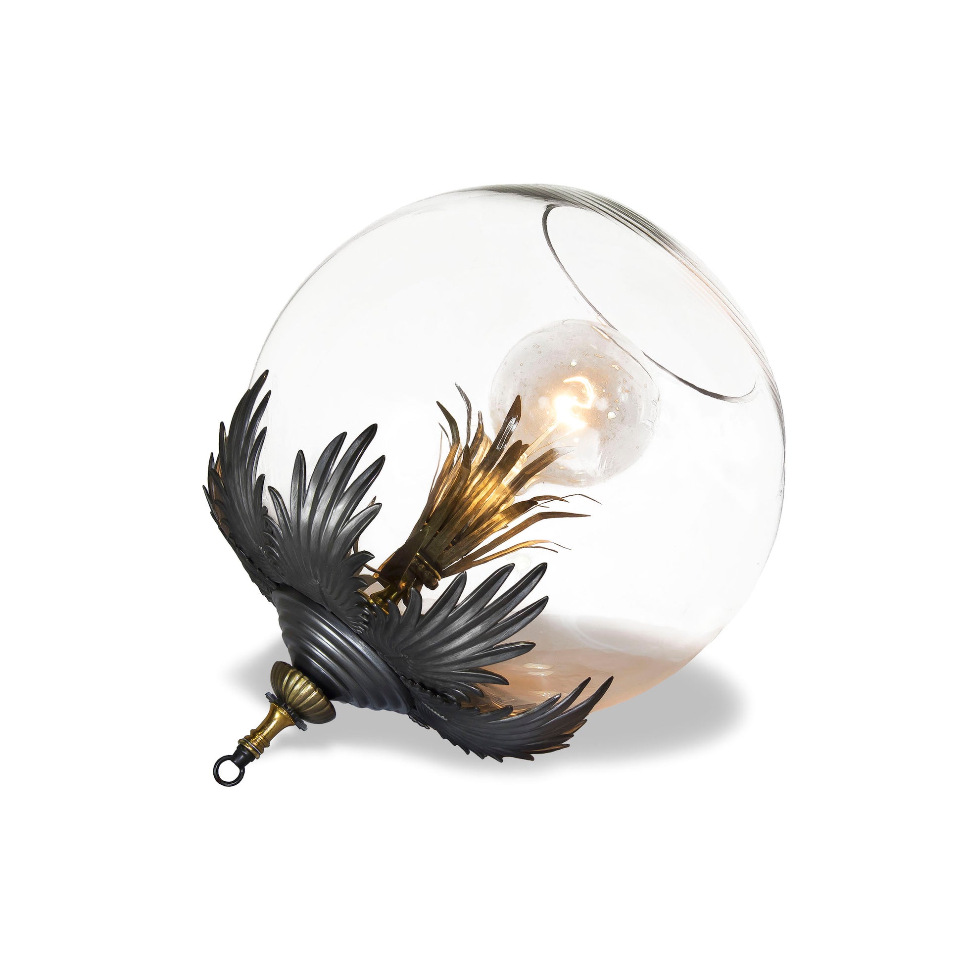Iron and brass hand painted details with pointed leaves in pewter is accented by clear crystal globe and oversized light bulb.