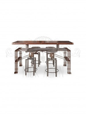 Steel metal plate top desk framed with solid wood border. Base construction 2" square metal. Wood in grey-stone wash. Brass corner caps.