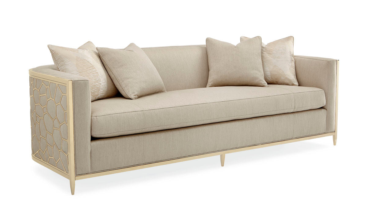 This is a sofa distinctive enough to design a room around. Its inspired look boasts a custom-designed pierced-metal frame with a modern honeycomb pattern finished in Gold Bullion. Covered in a timeless neutral cream fabric with a slight herringbone design, it has a refined yet dramatic presence that can be dressed up or down. Its geometric elegance and plush upholstered comfort will transform any room.
