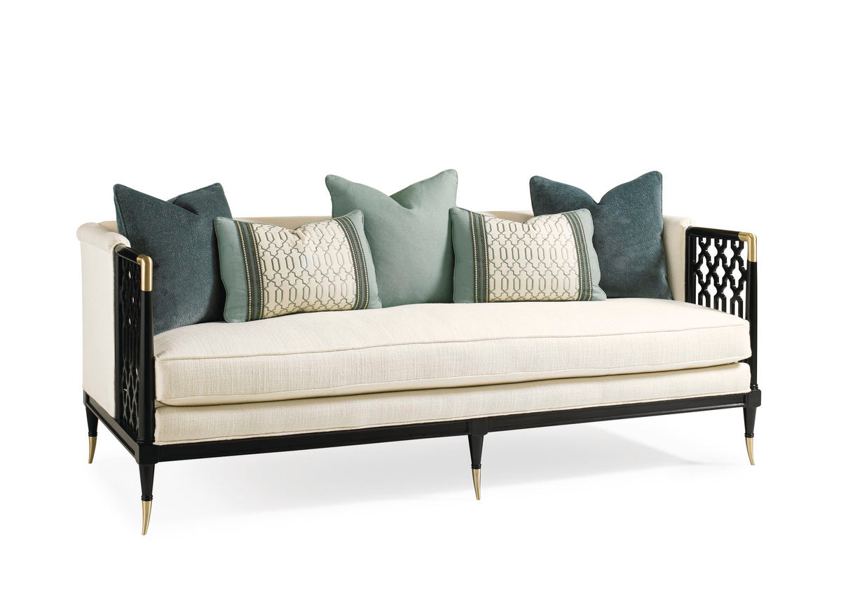 Elegant embroidered fabric was the starting point for this exposed wood frame, influencing the open fretwork design on each arm panel. The Tuxedo Black finish is further set off by matte brass plated metal accents and a lush textured fabric. Float this sofa in a room in which you are able to take in all the sides , as we think it’s stunning from every angle.