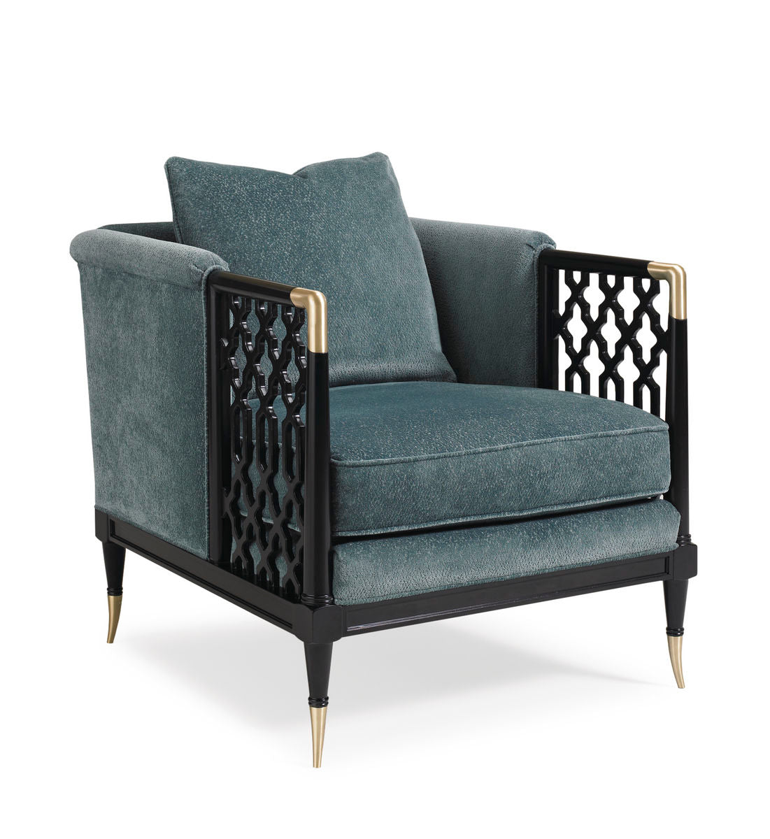 Elegant embroidered fabric was the starting point for this exposed wood frame, influencing the open fretwork design on each arm panel. The Tuxedo Black finish is further set off by matte brass plated metal accents and a lush textured fabric. Float this chair in a room in which you are able to take in all the sides, as we think it’s stunning from every angle.