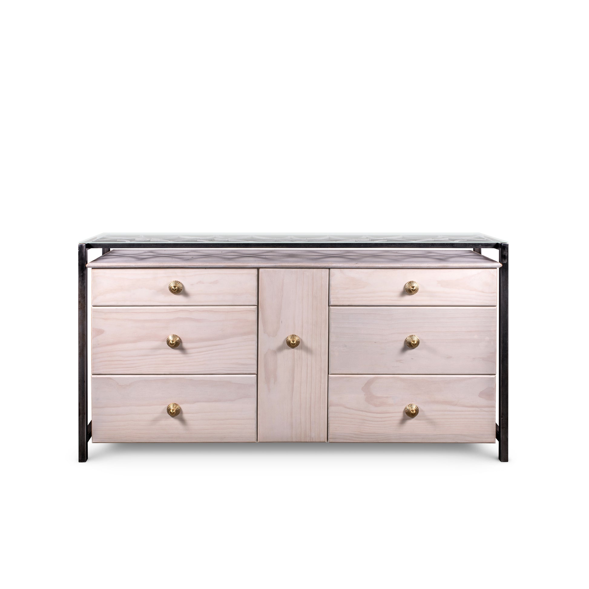 Elegant wooden dresser with metal frame and 3/8″ thick glass top.