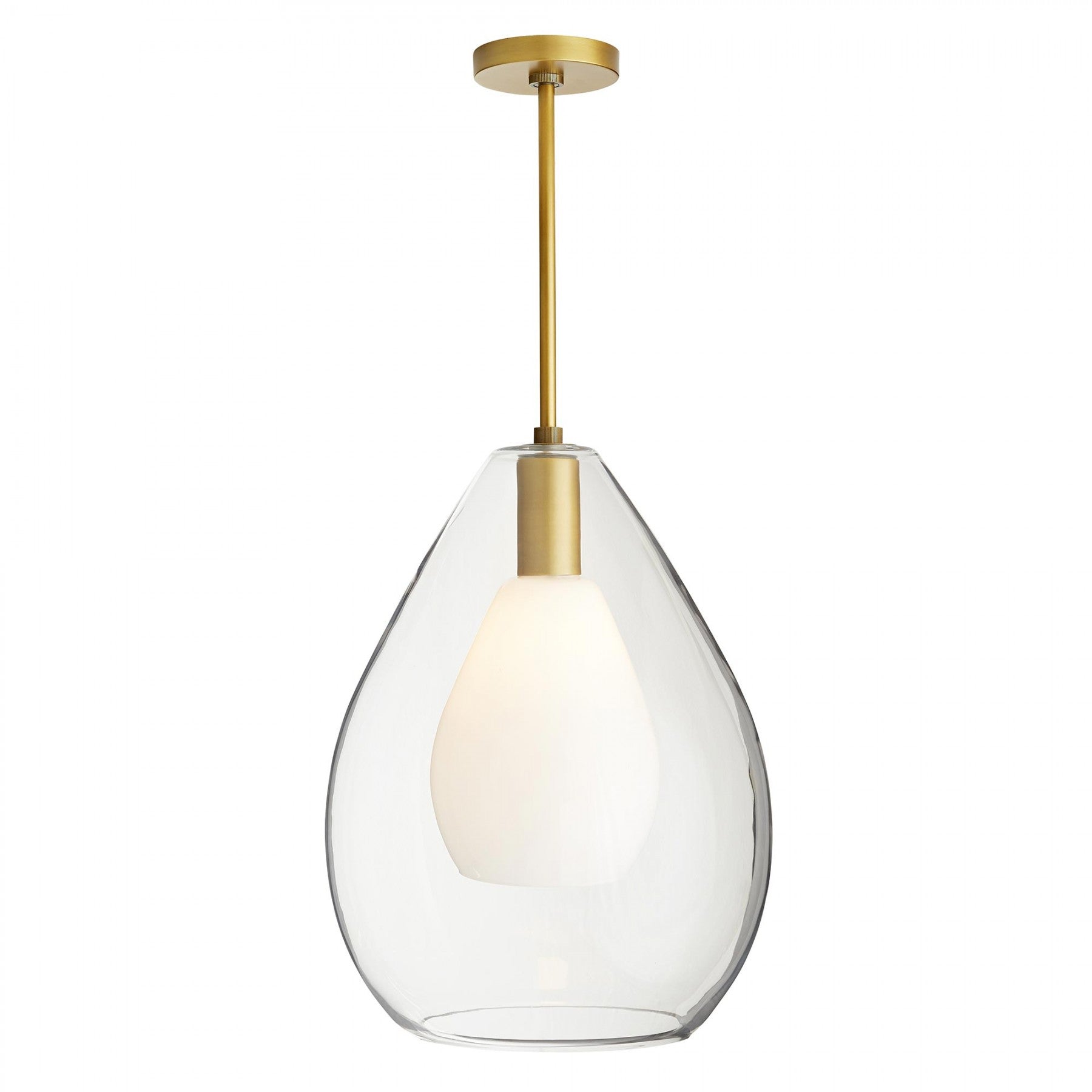 Two shades of hand-blown glass forms the drop of this pendant. Seemingly simple in its design, an inner teardrop-shaped shade conceals a standard bulb in opal glass, then a larger shade rests outside it, exposing the inner piece in clear glass. Both hang from a stainless steel stem and mount, both finished in antique brass. Additional pipe available (PIPE-180). Also available in brushed nickel (49174). Approved for use in covered outdoor areas.