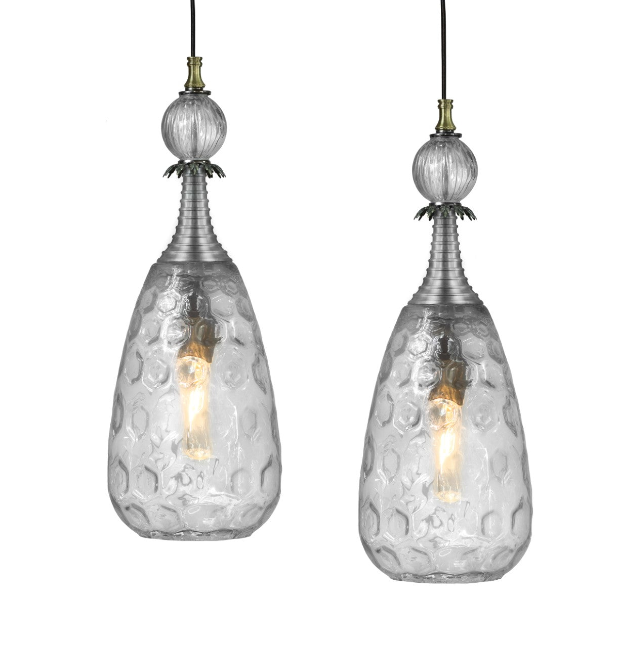 Honeycomb glass pendant in brush silver finish with 6′ vintage style fabric cord – can be custom made longer upon request.