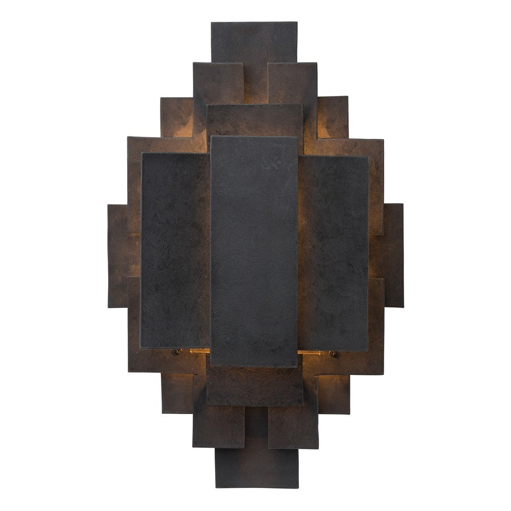 Inspired by the 1950s brutalist movement, this one-light, iron sconce is crafted out of hand cut geometric shapes, welded together into a tribal-like pattern. The wax finish helps keep the sconce natural – perfect for horizontal or vertical mounting. Damp rated and approved for use in covered outdoor areas.