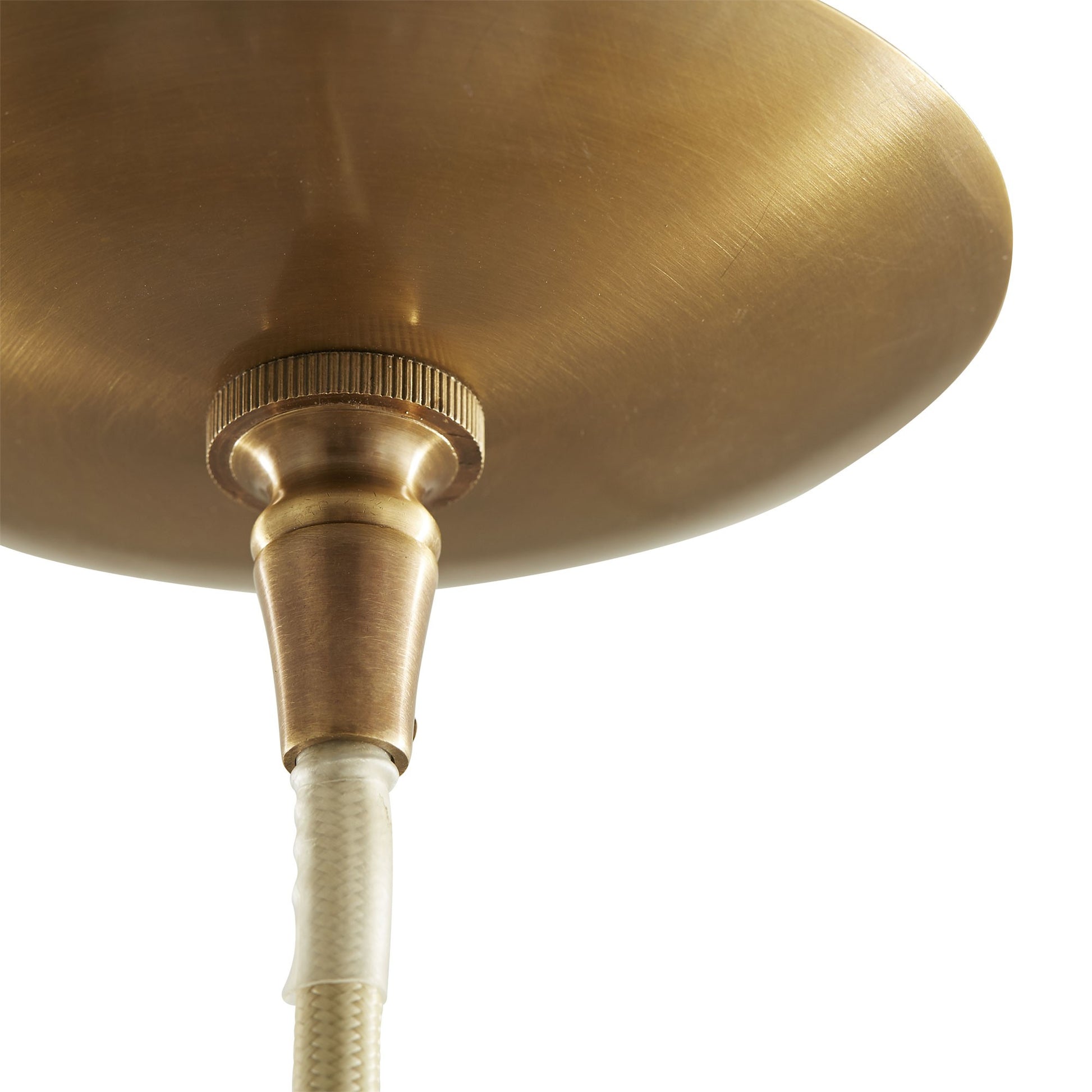 Molded clear glass sphere pendant cinched with an antique brass belt. Shown with Medium Clear Tubular Bulb.