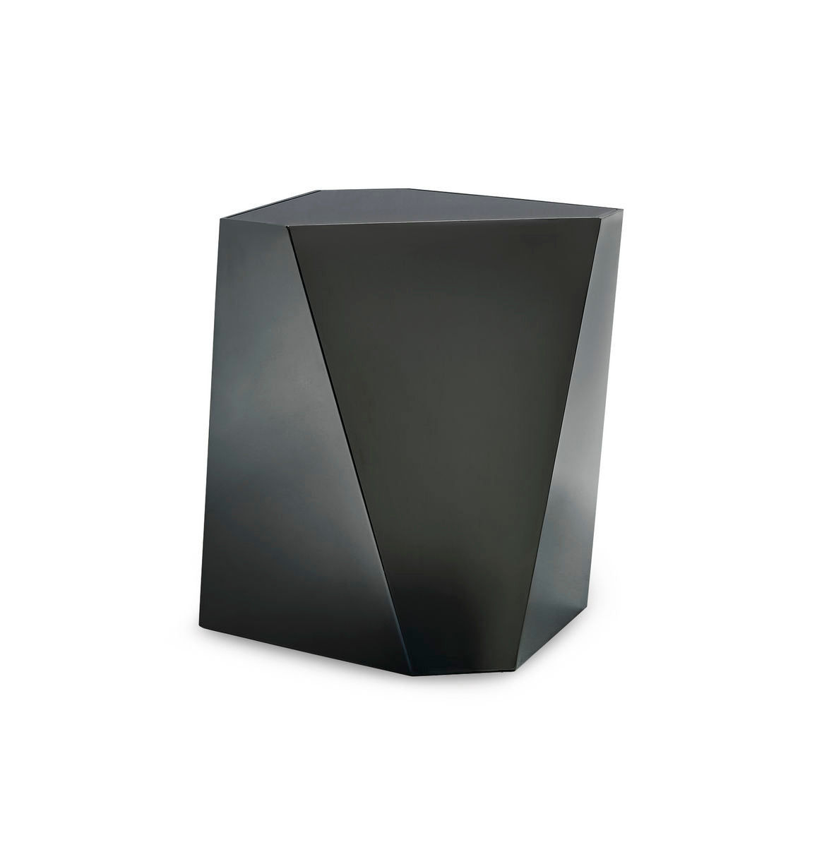 Distinctive design results in a side table that will stir a conversation in any room. The beauty of your decor is given a contemporary edge when it’s paired with the irregular angles of this hexagonal table. A black glass top compliments the deep bronze metal base. Place by a chair or sofa or group a couple together for an artistic display. Two sizes are available.