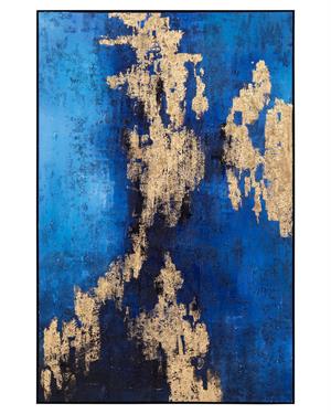 This highly textural piece by artist Bevis features brilliant tones of blue highlighted by dazzling metallic gold. The artwork is surrounded by a black floater molding.