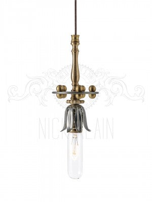 Suspended from a 40″ iron disk are 13 pendants resembling rains. Each pendant is hand crafted and made of iron with brass details. Length of each pendant is 6 feet long and can be adjusted to various sizes. Additional length can be requested at additional charge. Tubular 40 watt bulb included, bulb available at your local hardware store.