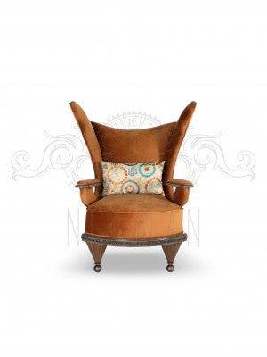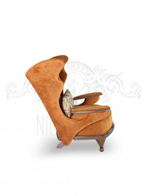 Solid wood frame with bronze colored nail heads. Arms rests with solid wood apron and metal legs. Chair tilts towards back for comfort. 21" x 14" pillow included. Many colors and fabrics available/swatches upon request.