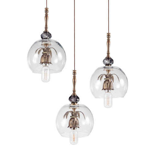 Beautiful glass globe with smoked crystal and intricate brass details in antiqued sienna and hints go gold.