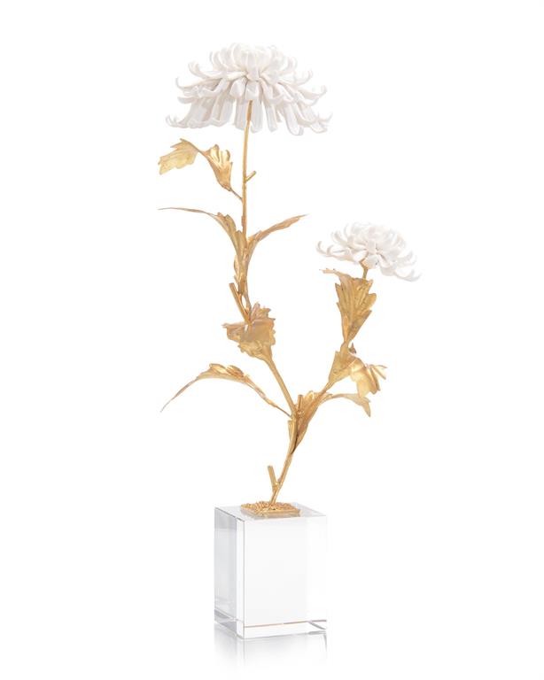 A pair of Avignon' chrysanthemums stand tall in white porcelain and gold on a crystal base.
