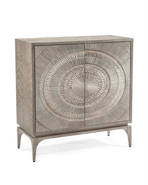 The doors have a silver-white radiating pattern from the center, and they are set in a gray oak case. Behind the auto-latch doors, there is one adjustable shelf.