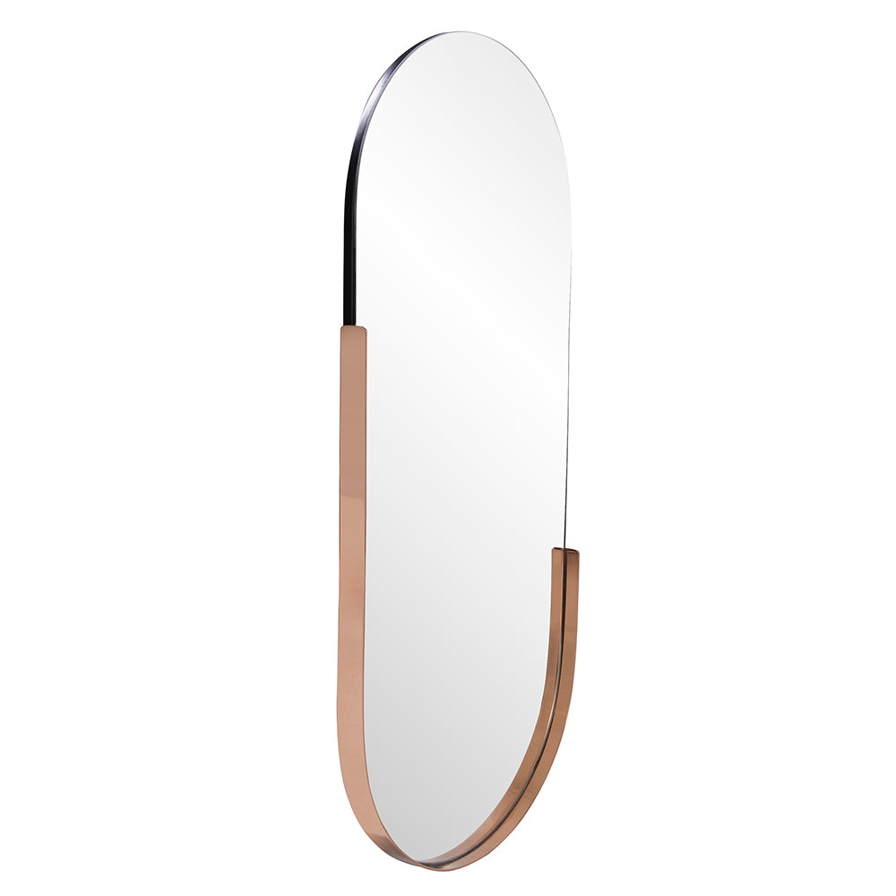 Our Dante Mirror is the definition of minimalistic style. With the idea that "less is more", this mirror features a long, oval shape and is partially trimmed in a flat, stainless steel frame in a striking polished rose gold. This design provides a contemporary flair that is sure to be that conversation piece. "D" Rings are affixed to the back of the mirror making it ready to hang right out of the box. This mirror can only be hung vertically.