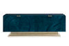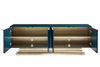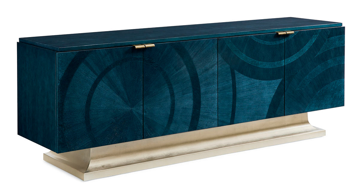 A stunning statement-maker, this impressive console is brilliant in blue. Its sleek silhouette is distinguished by an Art Deco-inspired pattern brought to life in a can't-miss shade of Peacock blue over Koto veneers and Bird's Eye maple inlays. A luxe Golden Blonde Leaf finish highlights its base while its four doors open with tab pulls to reveal generous storage space and adjustable shelving and wire management.