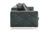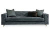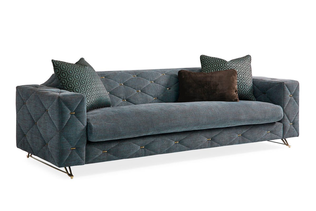 A one-of-a-kind beauty, this distinctive sofa captures the essence of Art Deco brought to life with Mid-century Modern design. Inspired by nature's influences, it features generously scaled arms and the clean lines of bench seating upholstered in a richly textured fabric with a stylish mix of sapphire blue contrasted by bittersweet chocolate. An eye-stopping diamond quilt pattern adds visual dimension, with each tuft punctuated by a metal cufflink-inspired bar tack. Stylish metal legs peek out from underneath and feature an open wishbone shape highlighted in Champagne Gold. Fashionable accent pillows with a embroidered geometric pattern in shades of soft peacock blue and chocolate brown make a coordinated fashion statement, and a fun, faux mink fur kidney pillow completes the sofa's stylish appeal.