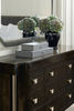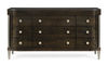 Dark Roast Figured Maple creates a "Dramatic Presence" as a triple dresser for a sophisticated bedroom or as a sideboard in a dining room. Its streamlined front is softened by generously curving drawers on each end that are punctuated by smooth columns bathed in Harvest Bronze. Smooth tapered feet are accented in Harvest Bronze. Lustrous gold square pulls mimic the subtle grain of the figured maple for dressy effect.