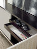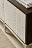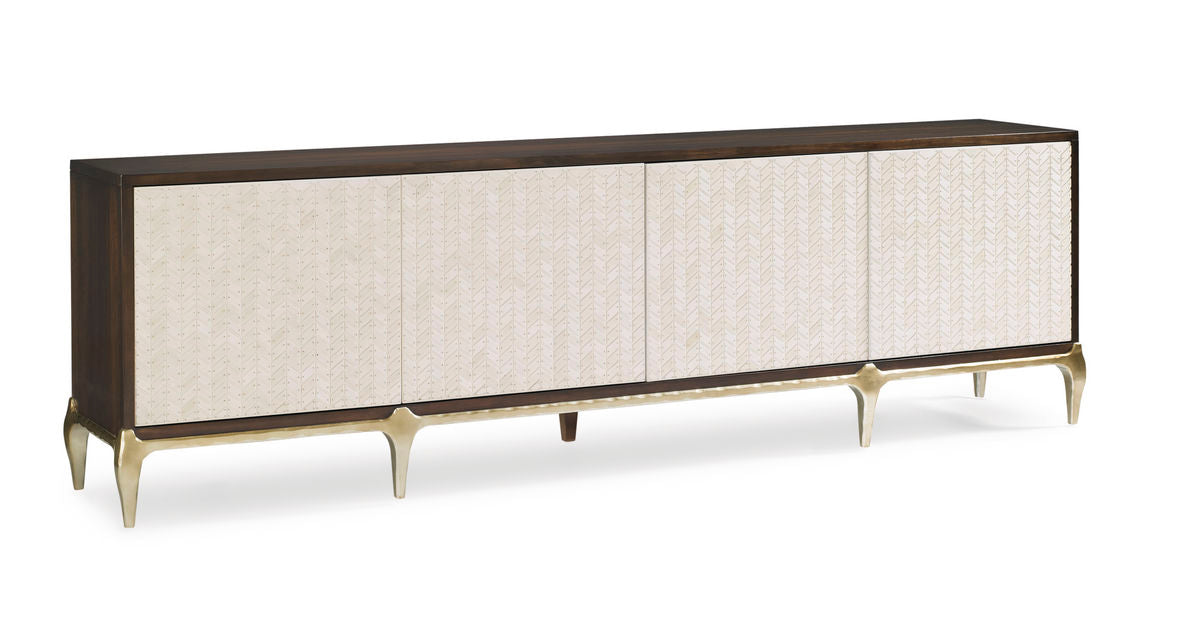 At 100-inches wide, there couldn't be a more dramatic centerpiece for both entertainment and design enthusiasts. Used with or without the largest plasma screen, the face of this cabinet is sure to capture everyone's attention. Each of the four touch latch doors feature over 300 pieces of white bone, individually applied and secured with petite, polished brass nail heads. The molded base is finished in Gold Bullion Paint. The cabinet case is made of fumed Eucalyptus veneers and hardwoods finished in a dark French Roast. If the movie isn't anything to talk about, this entertainment center will keep the conversation going.
