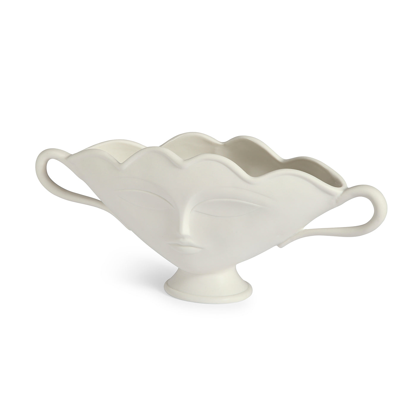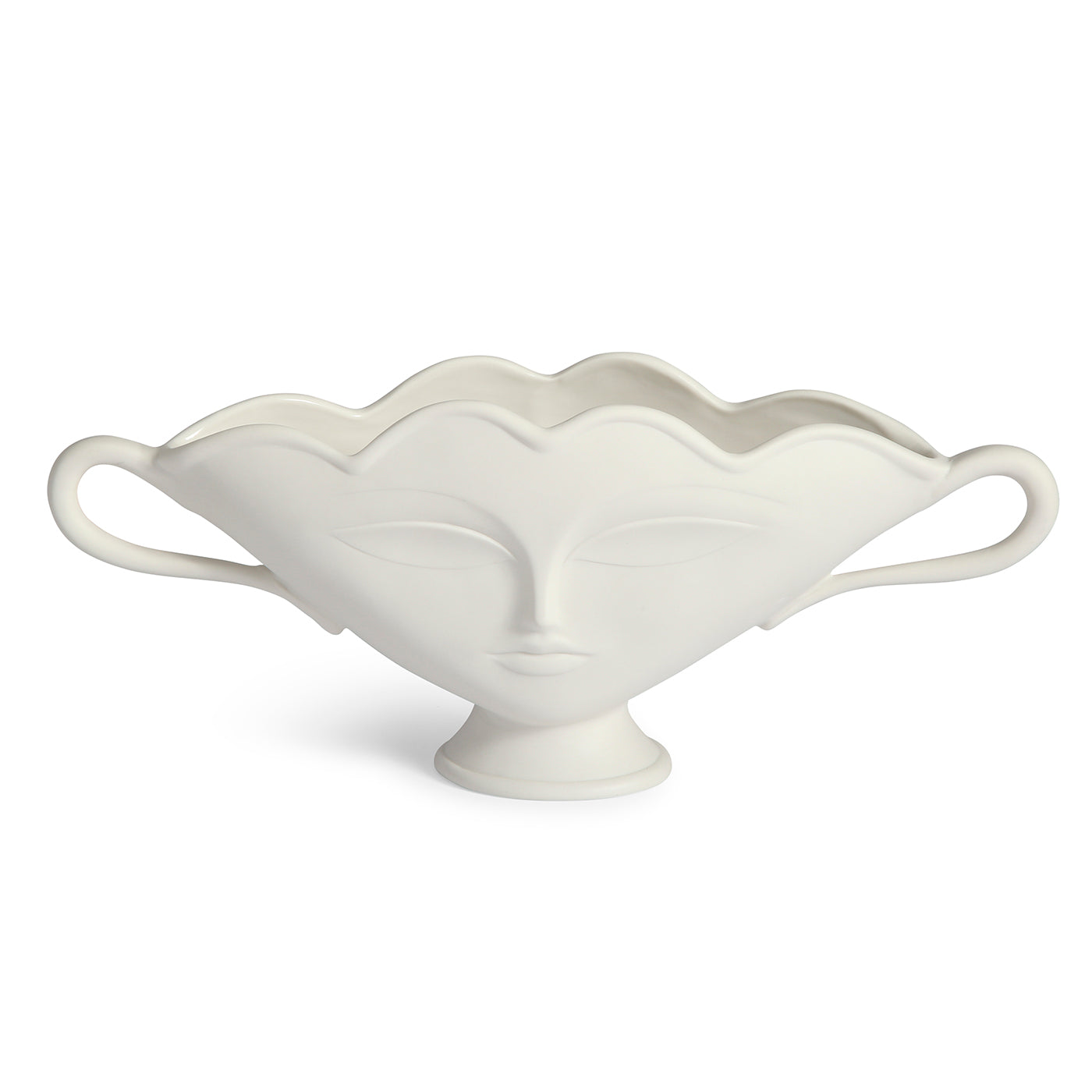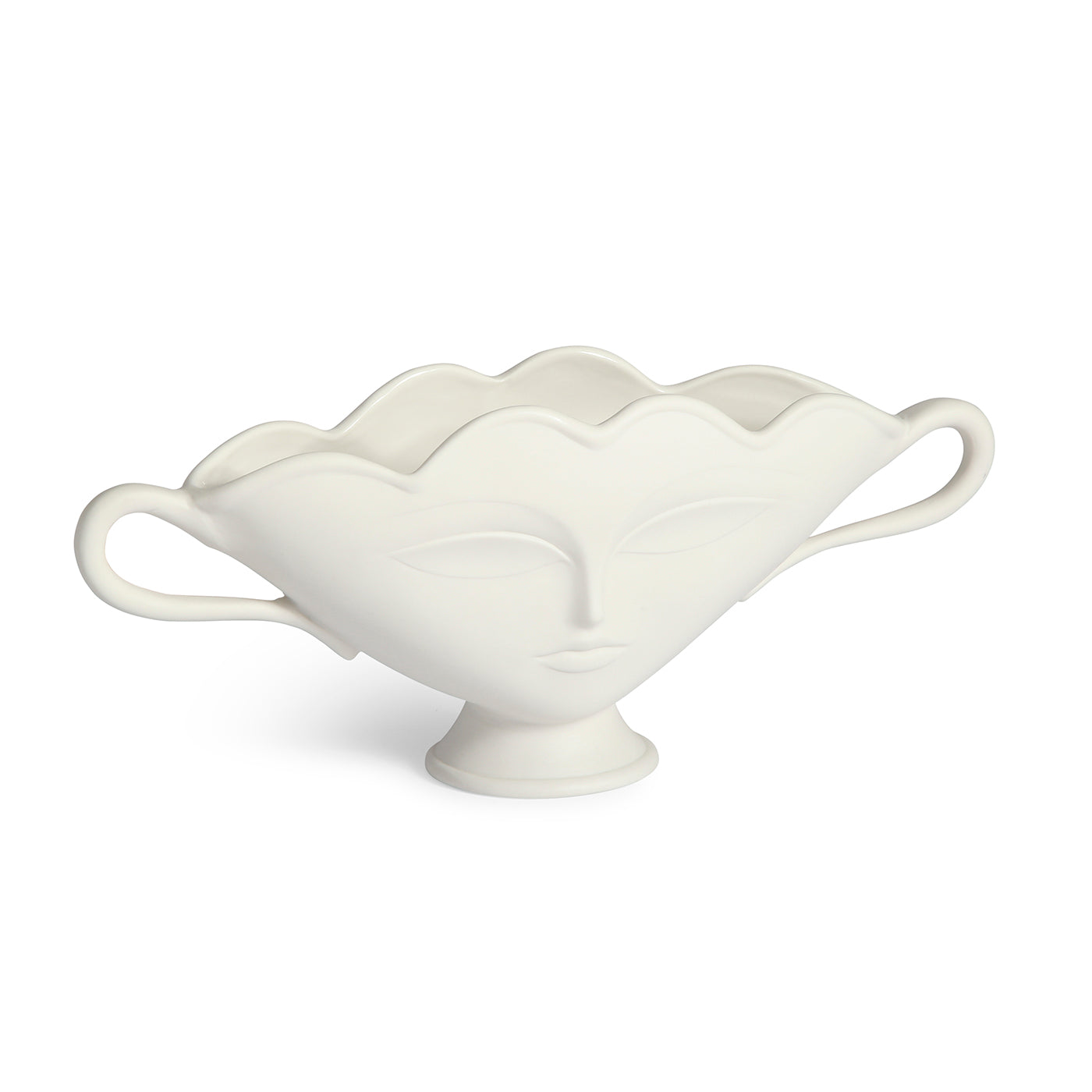 Take your tablescape from so-so to sublime. Made from white porcelain with a matte finish, our spin on this traditional, flower-friendly vessel features our muse Giuliette's ethereal face (on both front and back) and a lightly scalloped rim. This subtle show-stopper's shallow depth makes it a match for your mantelscape or console.