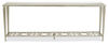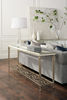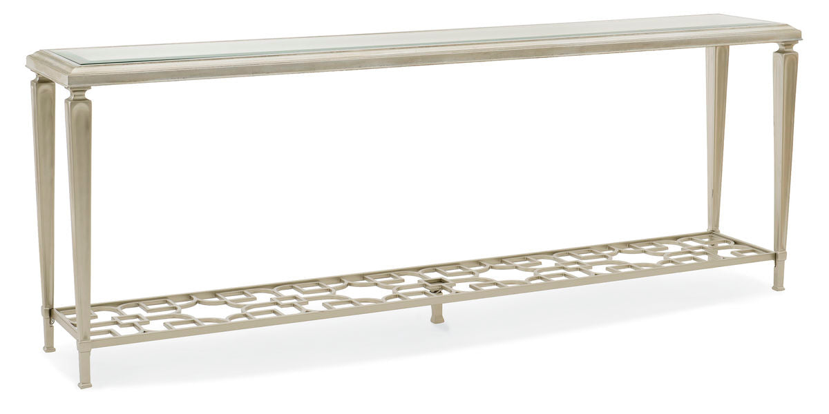 Open and alluring, this distinctive console table makes a bold statement. Its airy design is elegant in its simplicity and features an exquisite metal fret-patterned shelf that can be seen through its glass top. Tall metal legs reach skyward and support its clear glass top with 1 ¼" bevel. Finished in Taupe Paint and Taupe Silver Lear, it's perfect for behind a sofa or anywhere you need a touch of elegance.