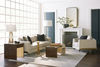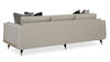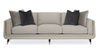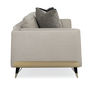 This captivating sofa exudes luxe appeal from its sumptuous seating to the refined tapered legs capped with gold heels and the most delicate bracing detail. Its upholstered base is graciously curved and cupped by a champagne gold metal plate. Perfect for lengthy conversations and entertaining, the three-seat design makes for a traditional appearance, while the nestled side bolsters say it's all about today's comfort. Upholstered in a neutral Congo taupe fabric and layered with sable and bittersweet chocolate color pillows, all which create a lesson in curated dimension thru the manipulation of color tones and textures.