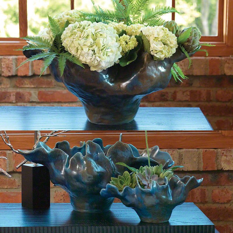 The original of this grand statement piece was created by a Portuguese artist whose work first caught our designers' eyes at an art fair in Portugal. It took years of collaboration to arrive at this design that can be consistently produced Multiple pieces are cast, bound together, and fired. Then it receives a reactive glaze and is fired a second time. There is a tremendous amount of artisan work that goes into every piece.