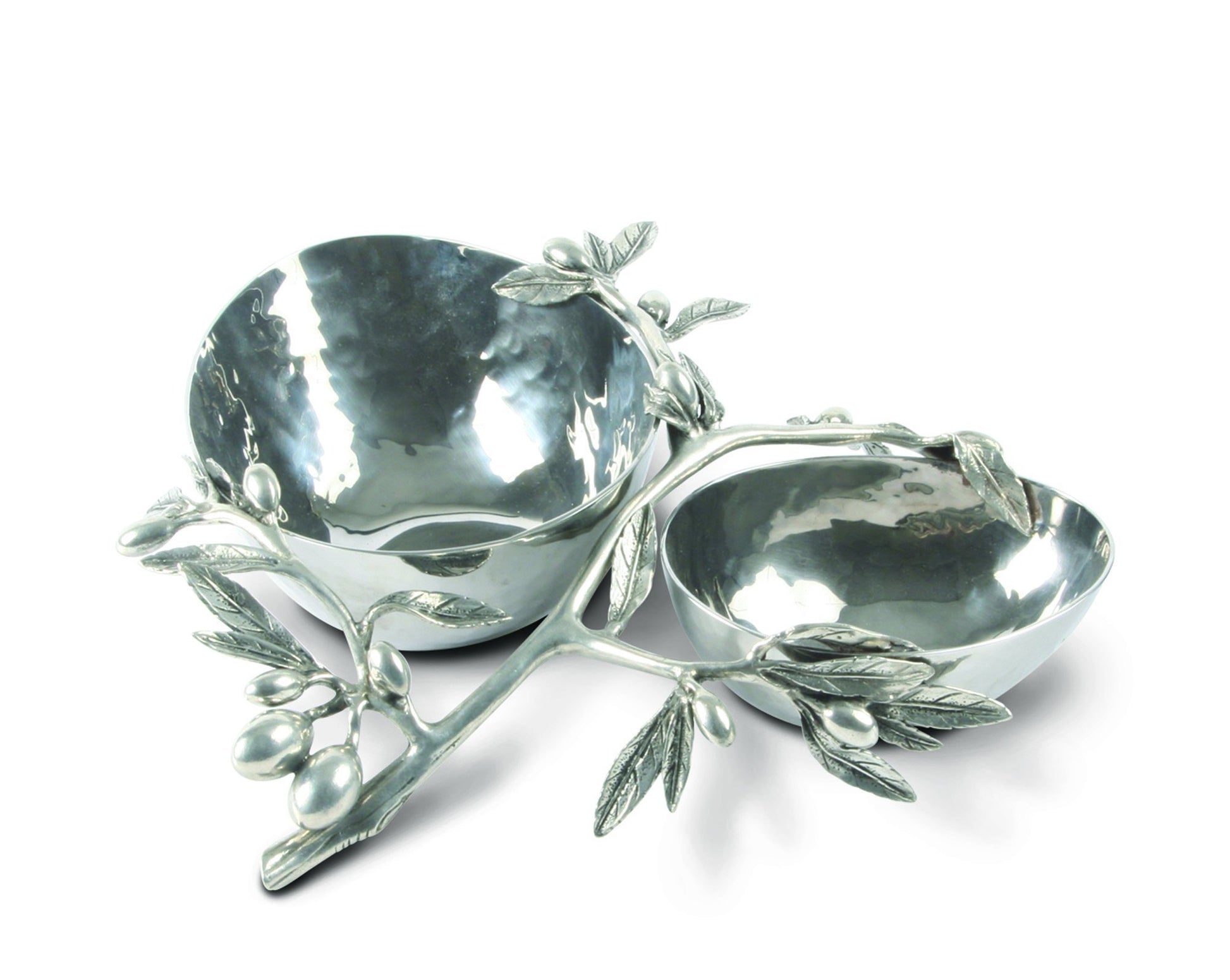 Offer peaceful greetings and delicious snacks to your guests with Vagabond House's Olive Double Serving Bowl. An olive branch stabilizes this piece as the handle, while leaves and fruit extend off of its pure-pewter design. The stainless steel bowls gleam against the veiny foliage and intricate lines within the figural wood.