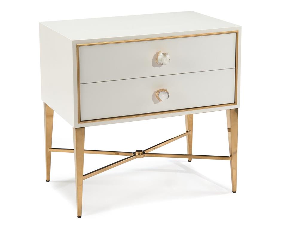 A two drawer nightstand. The case is finished in beluga white with gold detail framing the drawers. The case is mounted on a stainless steel base finished in polished brass. A crystal handle decorates each of the drawer fronts.