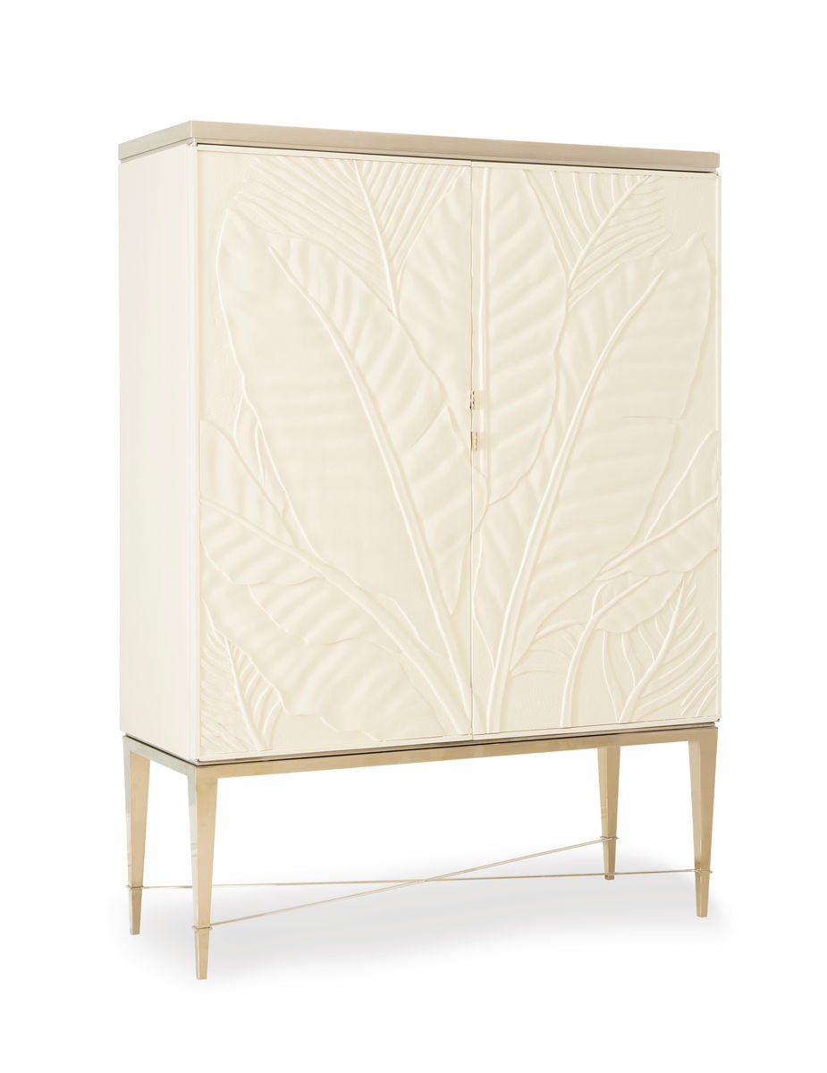 An artistic take on the classic palm tree, Palms Up! provides a stunning focal point for your living or dining room. However, beauty is not just skin deep. Behind the hand-carved doors reside the quintessential bar for entertaining. A white marble work surface sits atop a deep drawer for storing drink making essentials and two open shelves that will cradle your favorite wines. The interior is finished in a Soft Taupe and features a mirrored back with hanging wine glass holder. This closed storage piece truly sets the bar high.