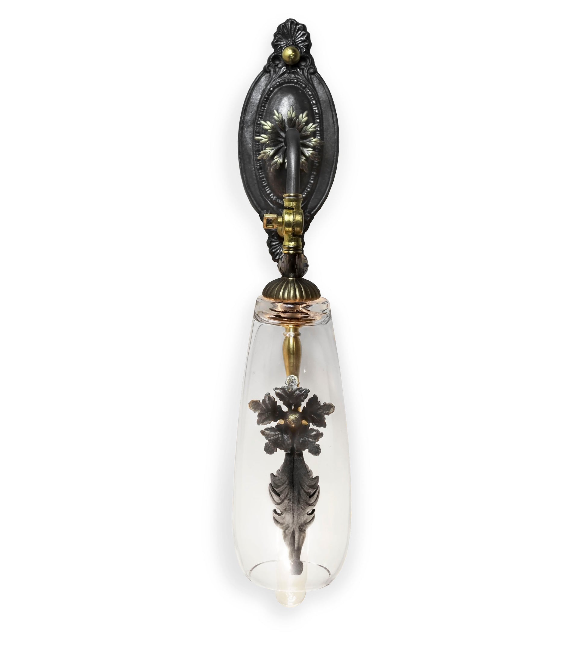 Industrial chic yet feminine, intricately hand forged wall sconce.