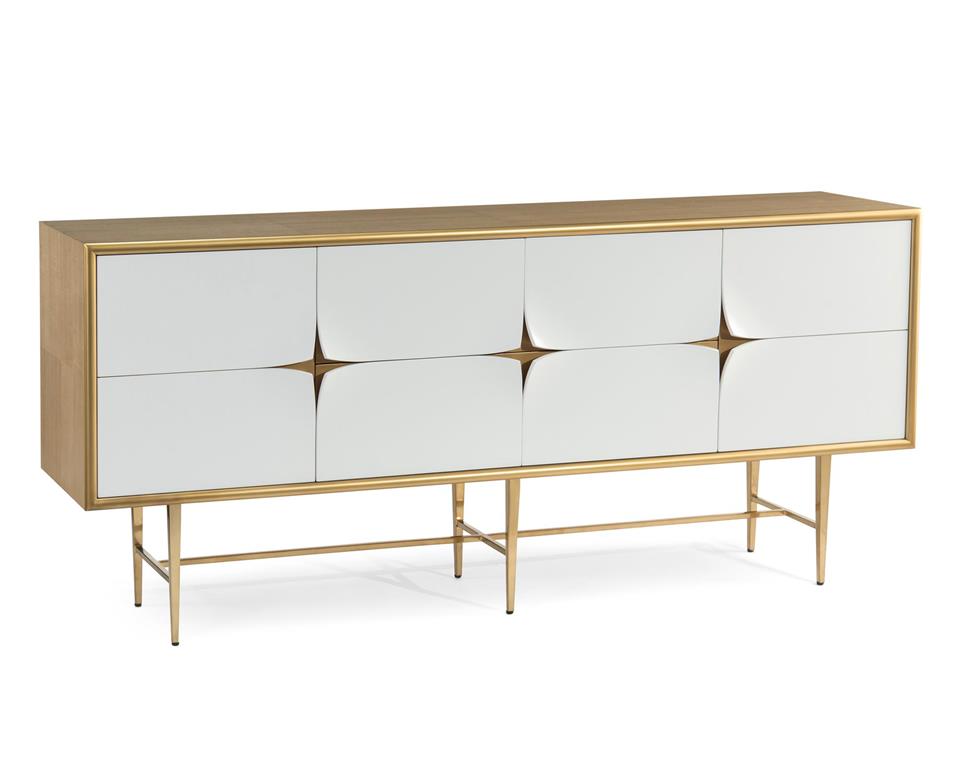 A modern sideboard in natural ash veneer and beluga front, framed in a bullnose molding of gold. The outer layer of the door and drawer fronts peels away to form handles and reveal a gold finish behind.
