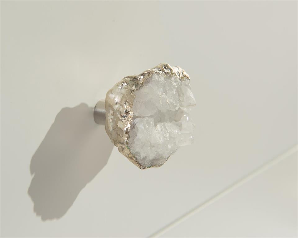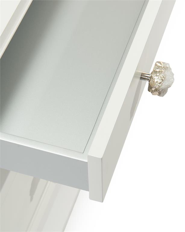 Finished in ice white, this chest features three graduated drawers with silvered crystal handles to the fronts. The carcass is raised on square tapered legs.