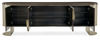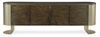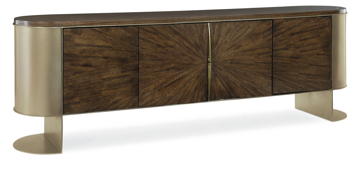 Handpicked for its uncompromising style, this credenza is destined to become a room's focal point. You can't help but stare at its unforgettably stylish doors crafted of radial matched Paldao veneers. Its metal frame and curved ends feature an exquisite Golden Blonde Leaf finish while its top wears a rich Galway finish. You'll find an adjustable shelf and tray drawer hidden behind the center doors. The resulting look is one of refreshing reinvention rich with character.