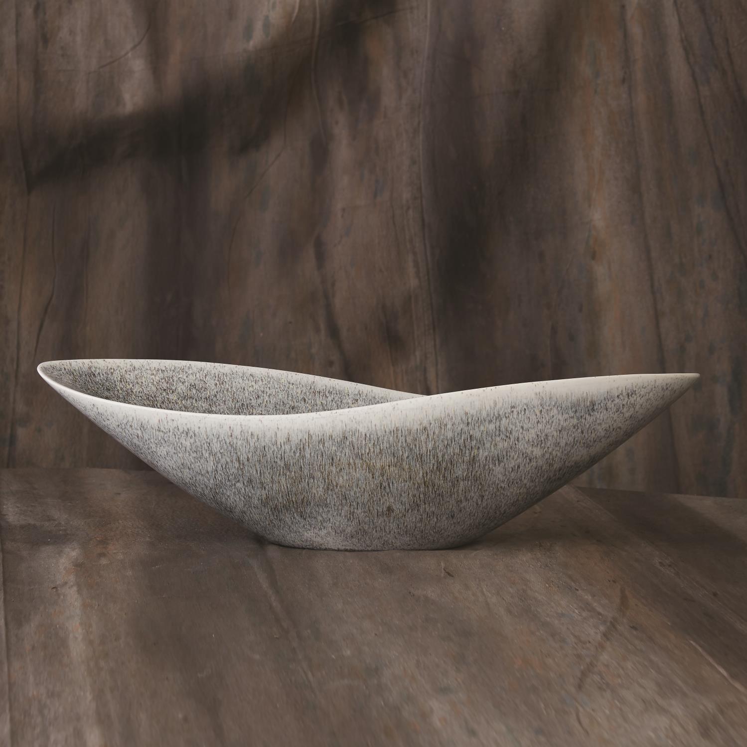 One of our best selling silhouettes of oval bowls, our Sexy Bowl is shapely and refined. Perfect scale and shape for those long narrow places in an interior such as a mantle, console table, or cocktail table with other objects. Glazed in a highly reactive grey glaze so no two will be alike. Not safe for food.