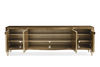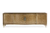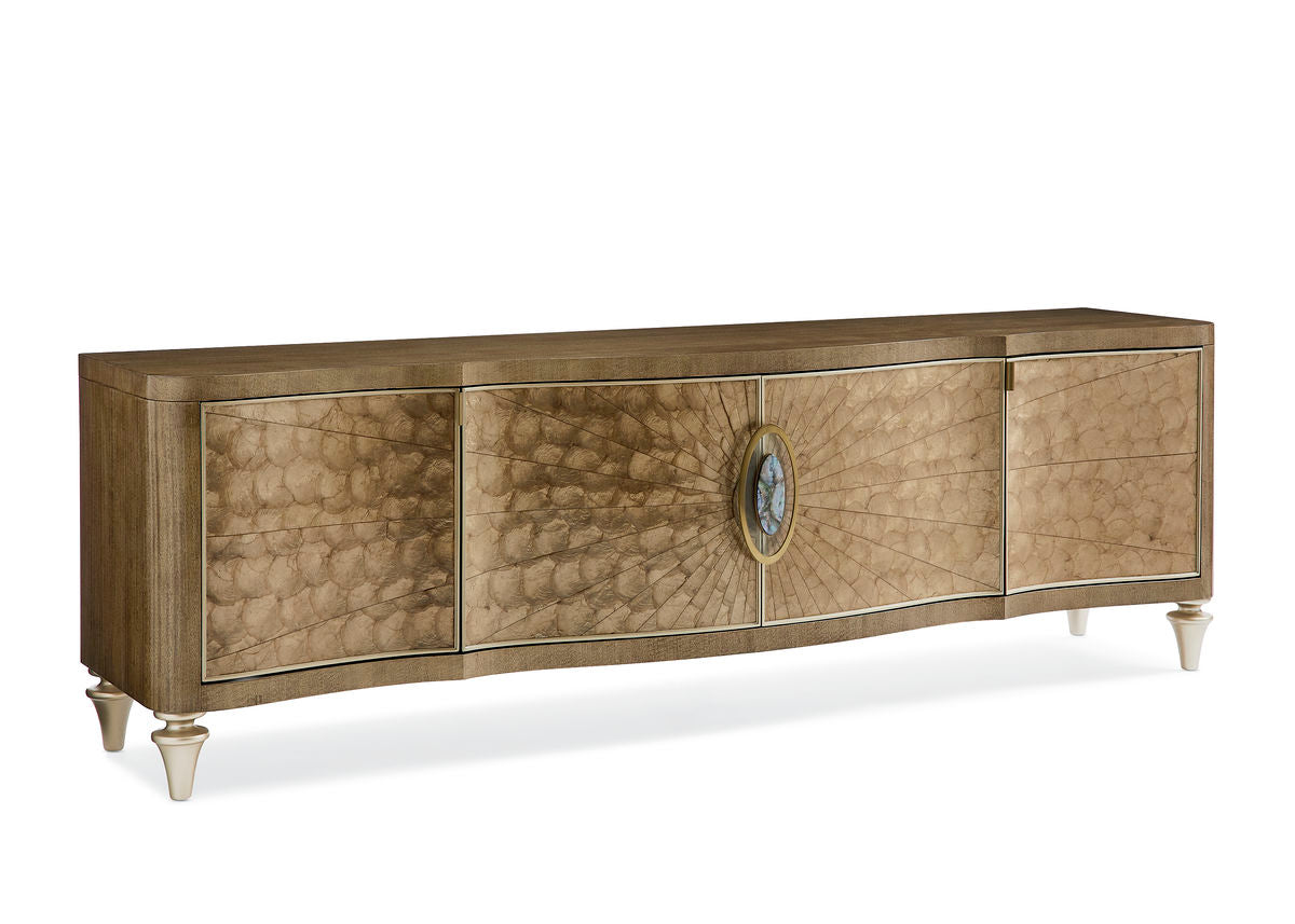 As extraordinary as a perfect shell sparkling in the sand, this distinctive console reflects the interplay of man and the environment. Its four stunning, shaped doors feature an extraordinary matched radiating pattern of Capiz shells that stretches out like rays from the sun. Its Capiz shell exterior is tinted in a warm golden brown and complemented by the rich Dappled mink finish accentuating its timeless silhouette. Distinctive hardware featuring an abalone inlay encased in acrylic and glass and finished in Champagne Reflections adds to its allure. Look behind each door and find an adjustable shelf and wire management for added functionality. A Warm Reflections finish adds luster to its legs, trim and interior.