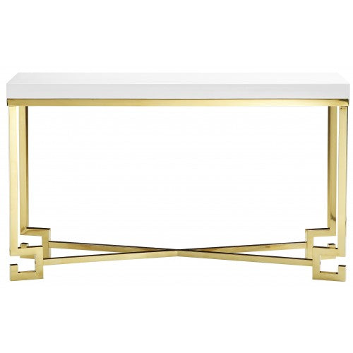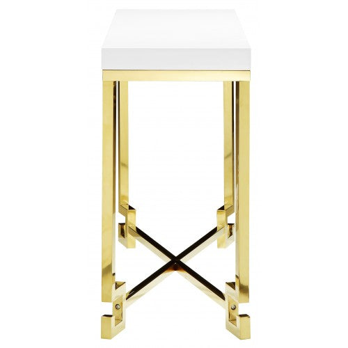 This console table is a stunning piece with a beautiful design that will quickly become the centerpiece of any space. Its high gloss top and polished gold legs combine to create a beautiful aesthetic that will elevate any décor.