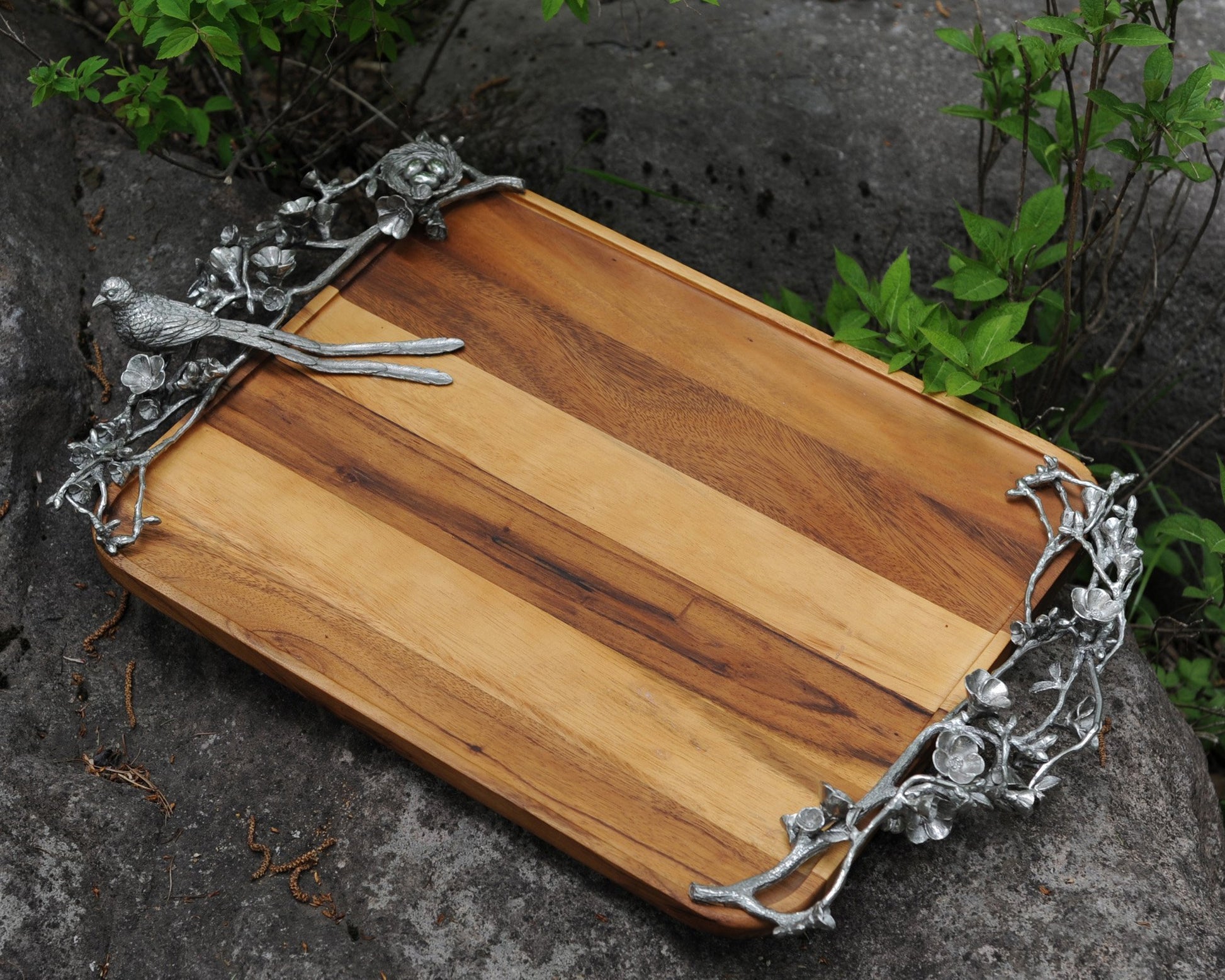 Your guests may break into songs of praise and delight when you serve with Vagabond House's generously sized acacia and pewter Song Bird serving tray. Created from lustrous, water resistant acacia grown only for Vagabond House, the uniquely chatoyant board is a true work of art. Exclusive and intricately detailed cast pewter sweet figural song birds and bountiful blooms embellish the handles of this heirloom quality tray.